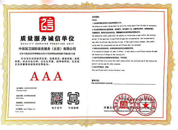 中保國衛(wèi)國際保安服務(wù)(北京)有限公司,屬中保國衛(wèi)集團(tuán)旗下子公司。能全方位的為大型客戶提供優(yōu)質(zhì)的安保、押運服務(wù),是集人防和技防于一體的新型正規(guī)化綜合安保押運服務(wù)企業(yè),提供人防、物防、技防、聯(lián)網(wǎng)報*、非武裝押運等安防相關(guān)的一站式服務(wù)。 公司在國內(nèi)多省設(shè)立有分公司及分支機構(gòu),著重提升安全押運、智能技術(shù)押運及安全技術(shù)防范相關(guān)的服務(wù),業(yè)務(wù)范圍覆蓋全國一、二線城市、港澳地區(qū)以及海外地區(qū)。安保方面主要為政府機構(gòu)、金融機構(gòu)、企事業(yè)單位、醫(yī)療衛(wèi)生、高等院校、工業(yè)園區(qū)、大型商場、高檔住宅、智能商務(wù)樓、大型活動提供門衛(wèi)、守護(hù)、巡邏、押運(非武裝)、安全檢查、保安特勤、私人護(hù)衛(wèi)、消防中控、安全技術(shù)防范、遠(yuǎn)洋護(hù)航等全方位服務(wù),同時面向國際市場,為中資企業(yè)在“一帶一路”沿線國家投資提供境外安保服務(wù)。 >> 更多內(nèi)容 |
